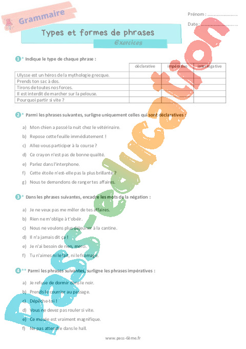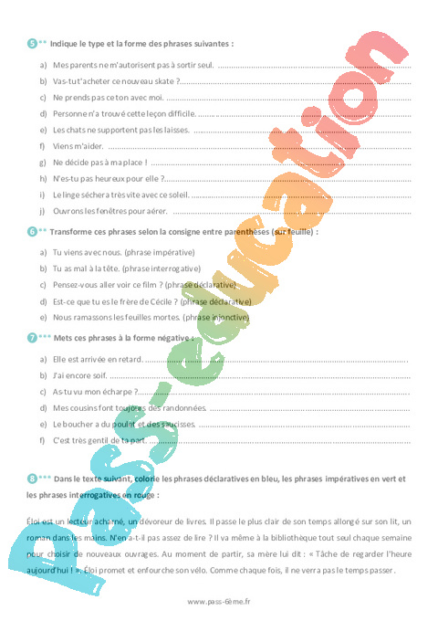 Exercices de grammaire avec la correction sur les types et formes de phrases en 6ème.