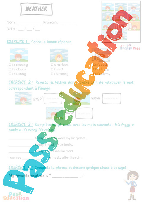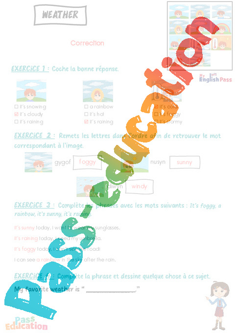 Exercice 3 : Complète les phrases avec les mots suivants : It’s foggy, a rainbow, it’s sunny, it’s raining.